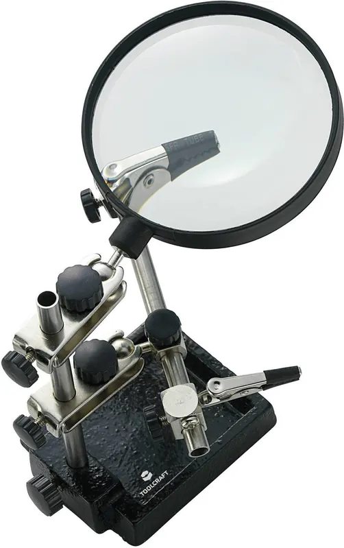 Instrument foarte util pentru lucrări de lipire şi asamblare. Clemele crocodil și lupa de sticlă mare sunt reglabile. Cu acest dispozitiv aveţi mâinile libere, iar circuitele imprimate şi componentele sunt menținute într-o poziţie fixă.Brațul articulat are o construcție metalică robustă, iar lentila de mărire este de înaltă calitate.