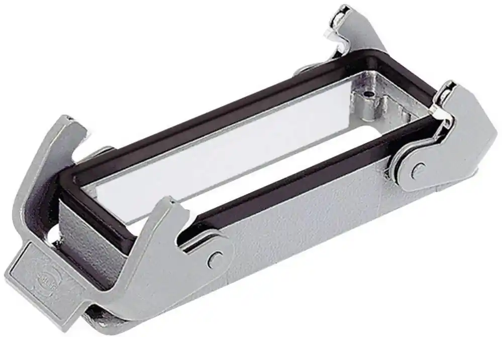 Carcasă specială pentru inserțiile HAN Hv E pentru aplicații industriale. Material: aluminiu turnat sub presiune. Carcasa este echipată cu o bandă adezivă pentru a crește rezistența dielectrică.