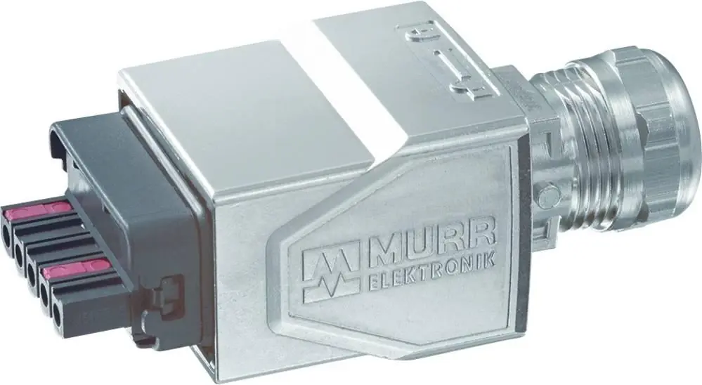 Conector alimentare tată cu 5 pini auto-conectabil. Atunci când se utilizează medii agresive, rezistența materialului trebuie verificată în funcție de aplicație.