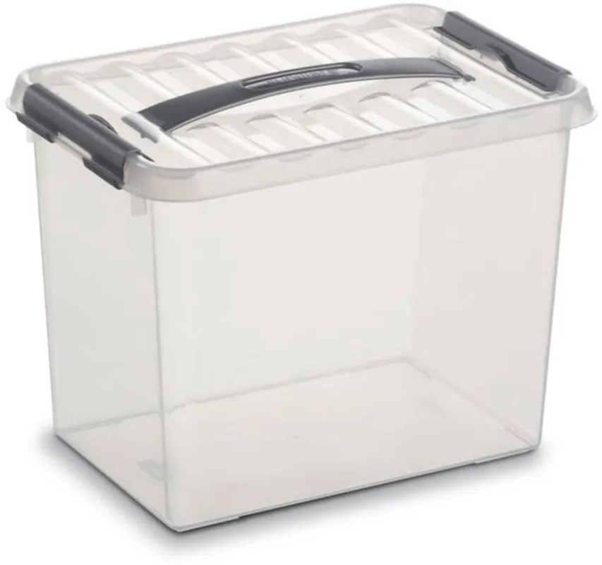 Cutie de depozitare transparentă, cu mâner de transport și capac, stivuibilă, fabricată din polipropilenă rezistentă la rupere. Posibilitate de închidere pe ambele părți. Atunci când sunt goale, cutiile pot fi așezate unele în altele pentru a economisi spațiu.
