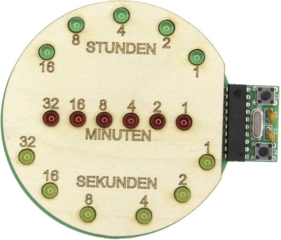 Kit-ul de asamblare pentru „ceas binar” este excelent pentru a învăța tehnici de lipire și pentru electricieni începători și tehnicieni amatori. Peste 40 de piese sunt lipite pe placa de circuit pentru a construi ceasul, inclusiv un microprocesor preprogramat. Acest lucru permite afișarea orei „binare” prin leduri. Un rând de leduri este alocat orelor/minutelor, iar altul secundelor. Ora reală se setează cu ajutorul butoanelor.Kitul electronic „ceas binar” este alimentat de la un acumulator extern sau de la un port USB. Panoul din placaj inclus afișează valorile binare. Acestea pot fi apoi convertite în valori zecimale. Dimensiuni: 100 x 80 mm.