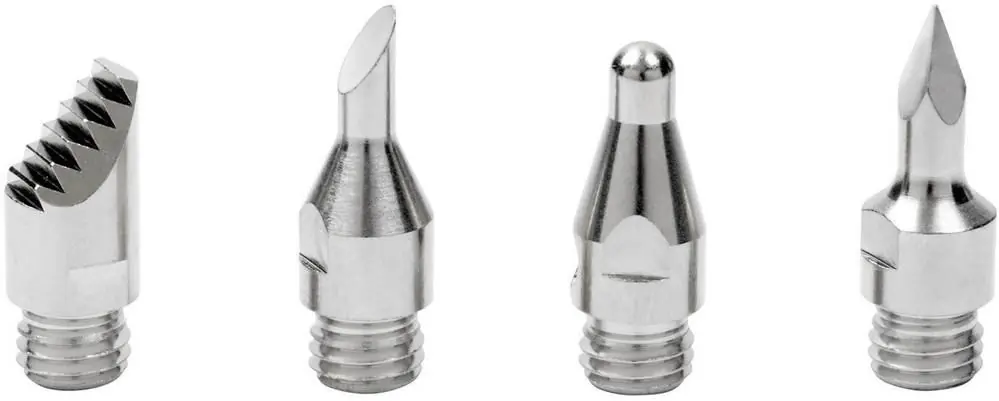 Aceste noi accesorii de pirogravură sunt utilizate pentru aaplica motive diferite de pirogravură pe lemn și piele. Setul includepatru vârfuri de forme diferite: vârf rotund, oval, ascuțit și model.Aplicațiile includ desenarea, realizarea de umbre, realizarea de dungi etc. Toate vârfurile trebuie utilizate cu Dremel® VersaTip.