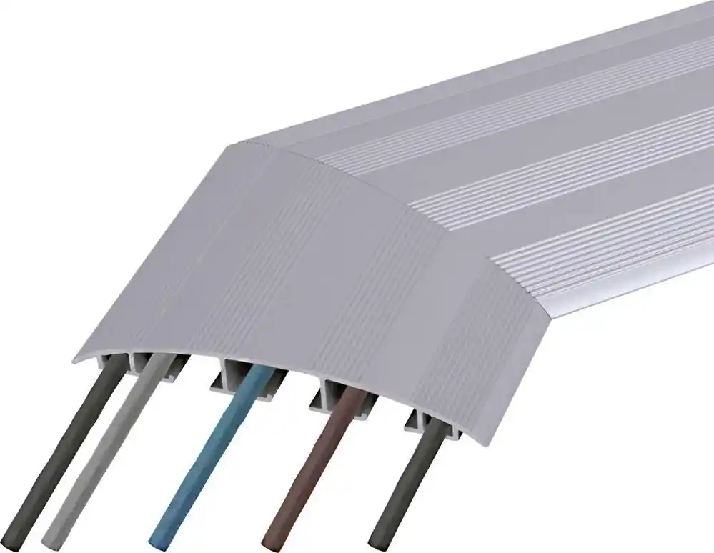 Profil din aluminiu anodizat cu structură cu striații pentru a preveni alunecarea. Sistem cu 3 canale pentru pozarea separată a cablurilor de alimentare și de date. Montare prin lipire (bandă dublu adezivă) sau pentru înșurubare pe podea.
