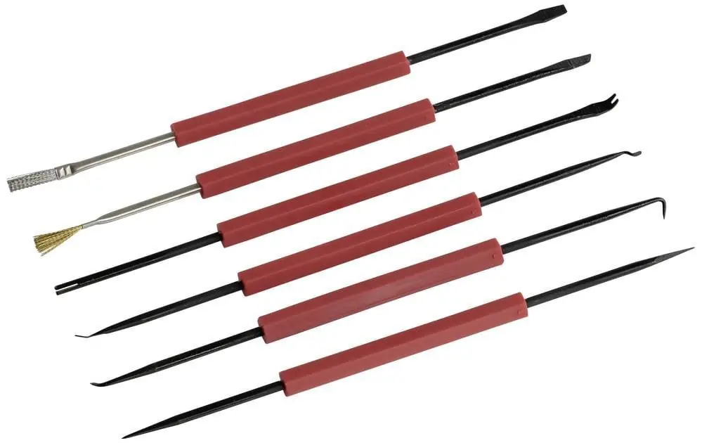 Set potrivit pentru toate tipurile de lucrări pe circuite imprimate. Setul include perie de curățare, diverse raclete, lamă, vârfuri de ac, dispozitiv de îndepărtare a componentelor și suport pentru componente.