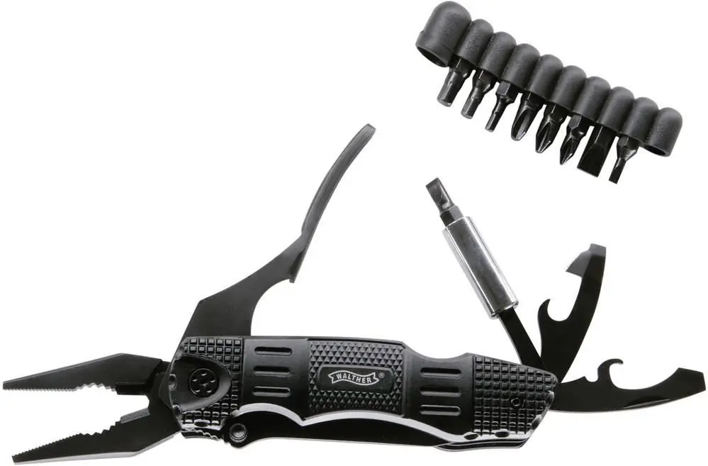- Walther MultiTac este o unealtă multifuncțional outdoor pentru condiții dure. Lama negru mat, parţial zimţată, are un mecanism de blocare Liner Lock. În mânerul cuţitului tactic se află unealta multifuncțională compusă din dispozitiv de spart sticla, deschizător de sticle, deschizător de conserve, șurubelniță, suport biți, cu biți de schimb într-o magazine separată ce se transportă în toc. O caracteristică specială este cleștele patent ultra plat, al cărui mâner poate fi rotit complet. Ideal pentru camping, alpinism, pescuit, vânătoare etc.
